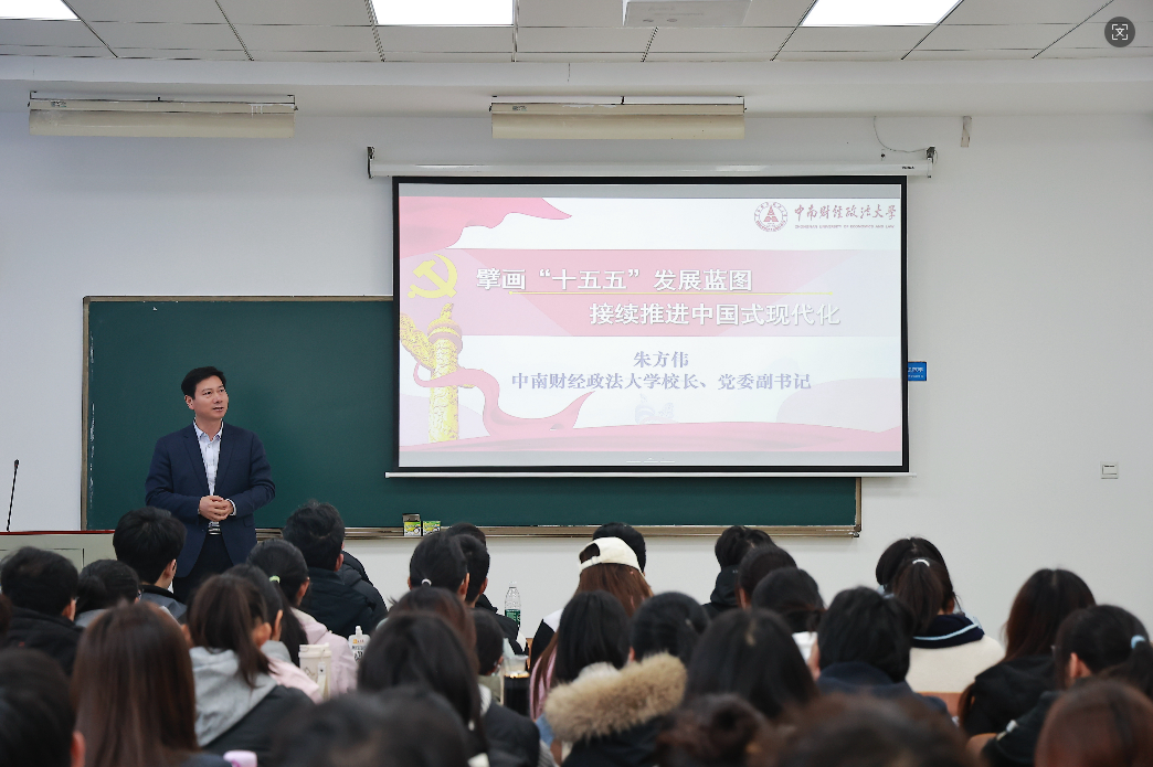 课堂上,朱方伟围绕“十五五”发展蓝图,从五个维度展开系统阐释,层层递进、逻辑清晰。一是回顾“十四五”时期我国取得的历史性成就,从12个方面逐一解读各个领域的关键数据、标志性成果及发展亮点;二是在梳理五年规划历程的基础上,深刻指出“十五五”时期是我国基本实现现代化承前启后的关键阶段;三是深入分析当前国内外复杂形势,指引学生要积极识变应变求变,以自身发展的确定性有效应对外部环境的不确定性;四是阐明“十五五”时期经济社会发展的指导思想和基本原则,强调“六个坚持”重要原则是一个内在统一、联系紧密、相互促进的有机整体;五是重点解读了“十五五”规划建议明确的七大发展目标,围绕十二项重大战略部署,系统阐释从建设现代化产业体系到统筹发展与安全的完整行动纲领。