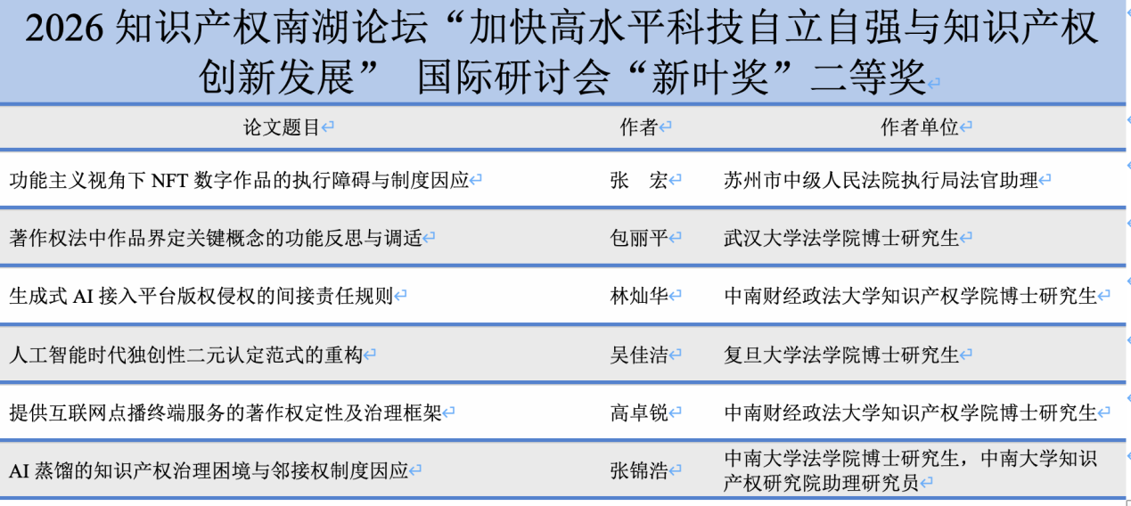 中南财经政法大学知识产权研究中心学术委员会主任、中国社会科学院长城学者、知识产权中心名誉主任李明德教授介绍了2026年“新叶奖”评审过程并宣布评选结果。本次征文活动收到来自多所高校以及律师事务所的青年学者、实务工作者的论文共计253篇。经过查重、初审、复审和终审等环节,最终评选出新叶奖获得者18篇,其中一等奖2篇、二等奖6篇、三等奖10篇。
